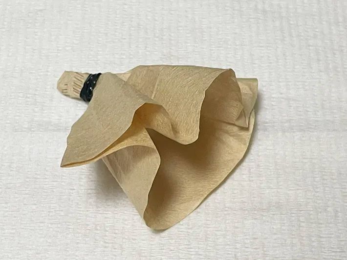 コーヒーフィルターの根元はゴムなどで固定しないと、水に浸した時に開いてしまいます。