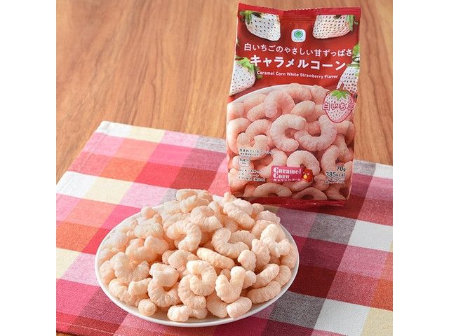 白いちごの甘ずっぱくてさわやかな味わいが楽しめるキャラメルコーンです。 [数量限定]
