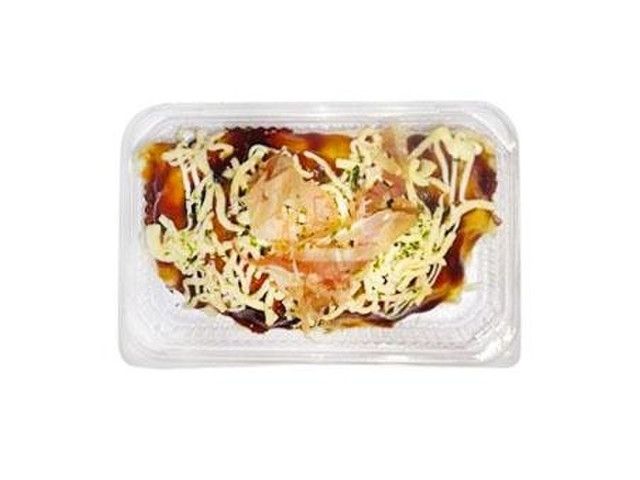キャベツと豚肉の包み焼にマヨネーズとソース、ゴーダチーズ、かつお節、あおさをトッピングしました。レンジで温めるとチーズが全体に広がり、まろやかでコクのある味わいがお楽しみいただけます。 【販売地域】東北・関東・東海