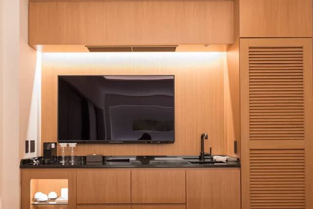 レジデンスフロアの客室にはコンパクトなシンクに加え、2ドアタイプの冷蔵庫や電子レンジもありました。