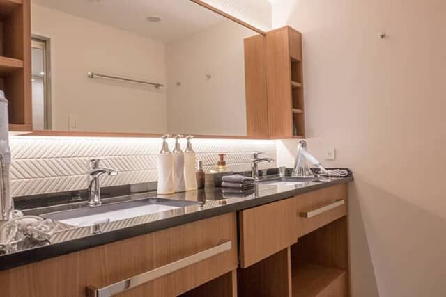 ReFa製品を使う頻度の高いウェットエリアは2人同時にメイクができるダブルベイシンを採用。バスルームで使うリファのシャンプーとトリートメント、ボディウォッシュも並びます。ドライヤーやヘアアイロンなどが大きな鏡の前で使えるほか、リビングでも使える小型のライティングミラーを備えます。