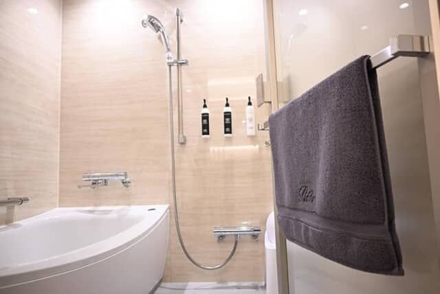 近ごろReFaのシャワーヘッドを備えたホテルが増えていますが、ワンランクアップしているのがこのバスルーム。通常のヘッドの1.5倍ほどある「ReFaファインバブル ダイア 120(ReFa FINE BUBBLE DIA 120)」が装備され、レインシャワーのように湯量が多く洗いやすいです。ミストやポイントジェット、ピュアストレートなど4つの水流モードがあって洗い心地を試せます。