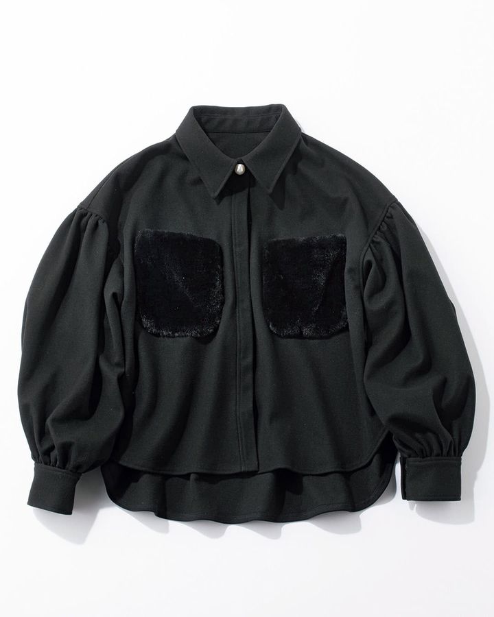 ファーにパールと可愛いが凝縮された中間アウター。厚手のフラノ素材を使用したアウターにもなるブラウスです。大粒のパール、リュクス感あるエコファーのポケットとディテールが凝っているので、これ1枚でおしゃれ見えが叶います。袖のあしらい方でも印象変化が楽しめ、ヒップもカバーする前後差付きです。