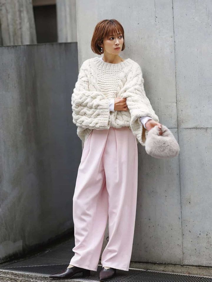 大胆な編み地とビッグシルエットの白ニットで、可愛さと体型カバーを両立。合わせた薄ピンクデニムが、白ニットコーデに新鮮な明るさと軽やかさをプラスします。シルエットにこだわったトレンド感のあるパンツがあれば、白ニットはベーシックでも即垢抜けます。