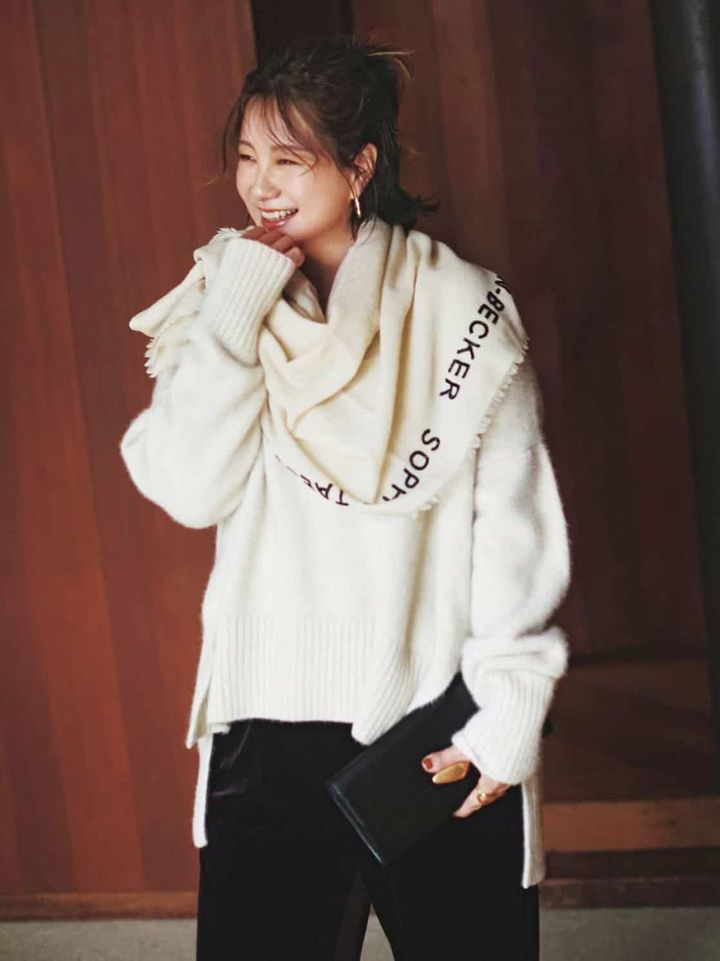 白ニットと黒パンツの王道ワンツーコーデに、ロゴストールで遊び心をプラス。大胆なロゴがドレープの動きを強調し、シンプルな白ニットコーデにリズムを生みます。小物ひとつで、ぐっと今どきの着こなしが叶います。