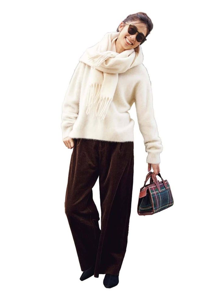白ニットのクリーンさを、ビターなブラウンパンツで引き締めた大人のワンツーコーデ。顔まわりには白マフラーをふんわり添えて、優しさと華やぎをプラス。旬のブラウンを効かせることで、シンプルな白ニットコーデも一気に今どきに更新されます。