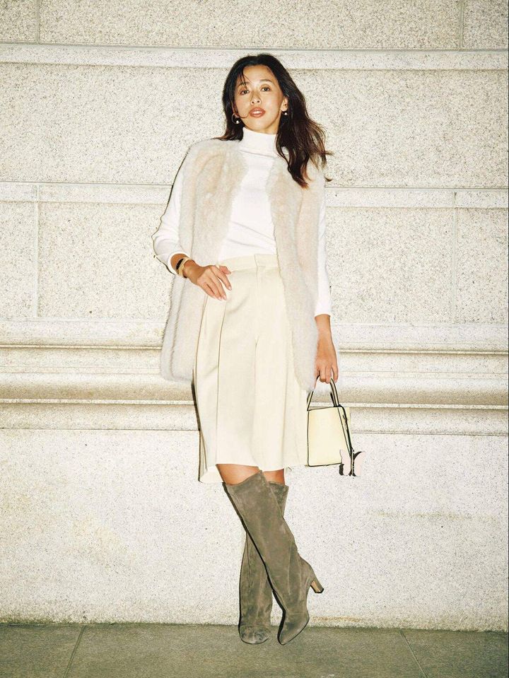 白ニットにウールハーフパンツ、ファーベストを重ねた旬度の高い白コーデ。同じ白でも素材感を変えることで、ぐっと華やかで立体的な印象になります。端正なハーフパンツなら、白ニット合わせでも大人が安心して冒険できます。