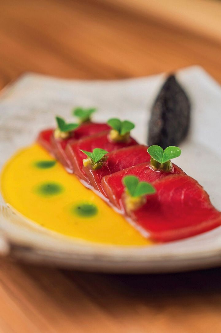 1階はカウンター、2階は大きなテーブルのあるダイニング。活気のある店内で飛び交うのは英語やフランス語……そして日本語。居酒屋の親しみやすさと、香港などアジアの都会的な感覚が重なり合うことで、「ここはどこ?」と迷うような独特な心地よさを生み出しています。焼きおにぎりを鮑のスープと合わせる「UNIGIRI」(3,980円)や、たくあんソースと海苔の佃煮を添えてトロたく気分でいただく、写真の「鮪の刺身」(2,380円)など。