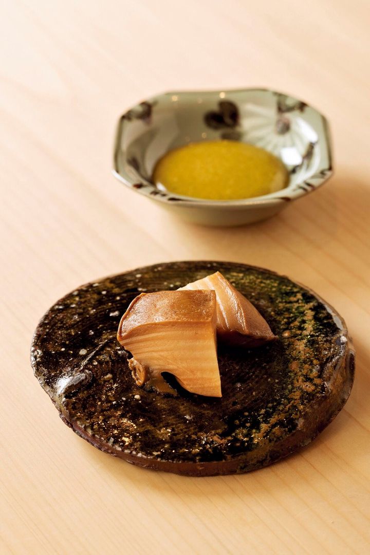 木の香りがすがすがしい店内で、樹齢200年という吉野檜の一枚板カウンターが目に入ってきます。異文化の中で日本料理の本質を見つめ直した大矢庸二さんは語学堪能、海外ゲストをもてなす際にも安心です。25年『ミシュランガイド東京』の一ツ星を獲得。写真は「鮨よしたけ」直伝の手法で6時間蒸した蒸し鮑と肝のソース。