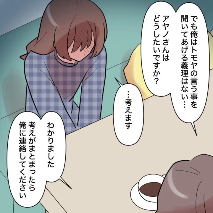 「でも俺はトモヤの言うことを聞いてあげる義理はない、アヤノさんはどうしたいですか?」ナオキさんの問いかけに、私は言葉を詰まらせます。トモヤのことは心底気持ち悪いと思います。けれど、ヒマリの存在を思うと、すぐに答えを出せない自分もいました。私は「・・・考えます」と、小さな声を絞り出します。