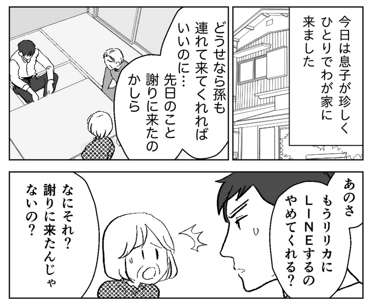 タツヤが珍しくひとりでわが家に来ました。来るなら孫を連れてきてくれたらいいのに。タツヤは先日のことを謝りにきたのかと思いきや、「もうリリカにLINEするのやめて」なんて言い出しました。
