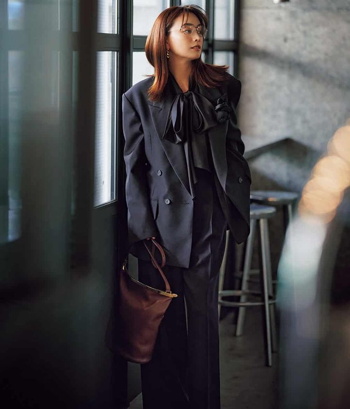 光沢感のあるジャケットをゆるっと、着こなすことで隙と親しみを添えて今っぽさをさりげなくプラス。〝多スク〟な日々にも対応できるフレキシブルさで働く日常に寄り添う名品。