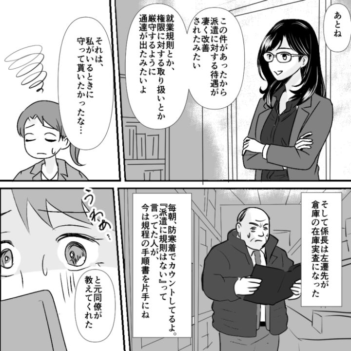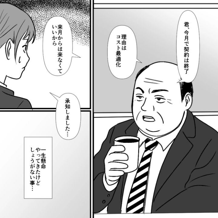 主人公は派遣社員として働いています。ある日、コストカットを目的に派遣契約の終了が告げられ、仕方がないことかと思っていたのですが・・・。