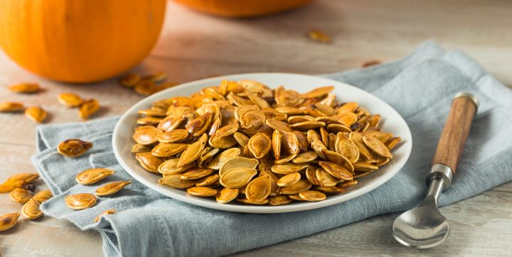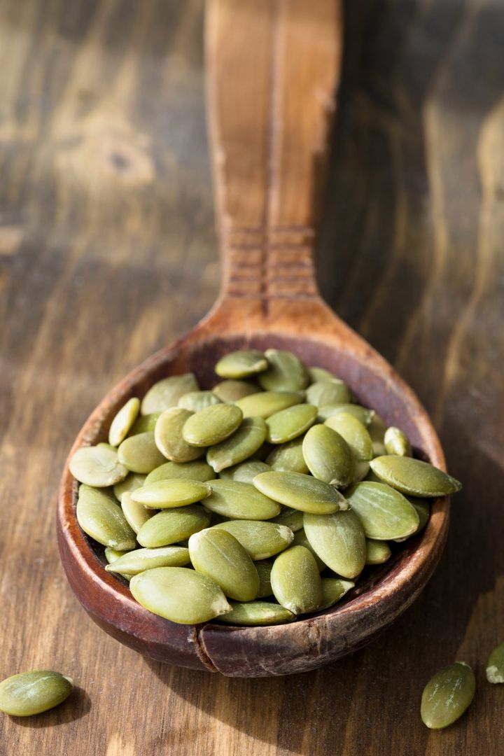 かぼちゃの種(ペピータとも呼ばれる)は100gにつき530mgのマグネシウムを含む。ヨーグルトやシリアルに振りかけたり、午後の軽食として食べれば、植物性食物繊維とたんぱく質の摂取量アップに役立つ。