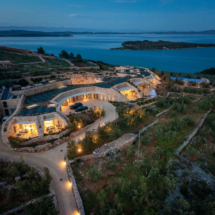 「ヴィラ・ナイ 3.3」は古代からオリーブの産地として栄えた場所として知られるクロアチアの離島、ドゥギ・オトク島のオリーブ畑の中に建つ。敷地の上に建物を建てるのではなく、丘の斜面を彫り込んで建築をつくりあげたユニークな宿泊施設。掘削で出た石を建物の主要な材として再利用することで排出量の削減を実現。さらに建物のデザインはドライストーンウォーリングというこの地方の伝統的な石積の技法を取り入れることで、周囲の自然と美しく溶け込む建築となっている。設計はクロアチアの建築家、ニコラ・バシッチが手掛けた。