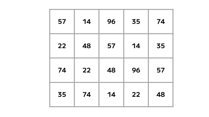 画像の表は横5マス、縦4マス。 そこに「14・22・35・48・57・74・96」という7種の数字が配置されています。