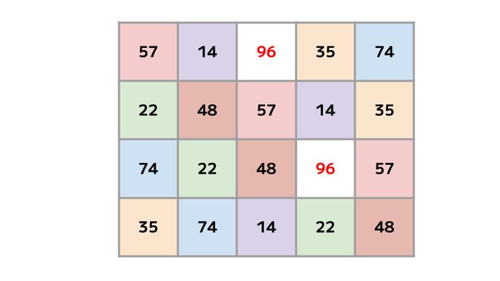 表を埋める「14・22・35・48・57・74・96」という7種の数字。 全部3つずつあるようにも見えますが・・・、実は2つしか配置されていない数字があるんです! その数字を見つけられますか?