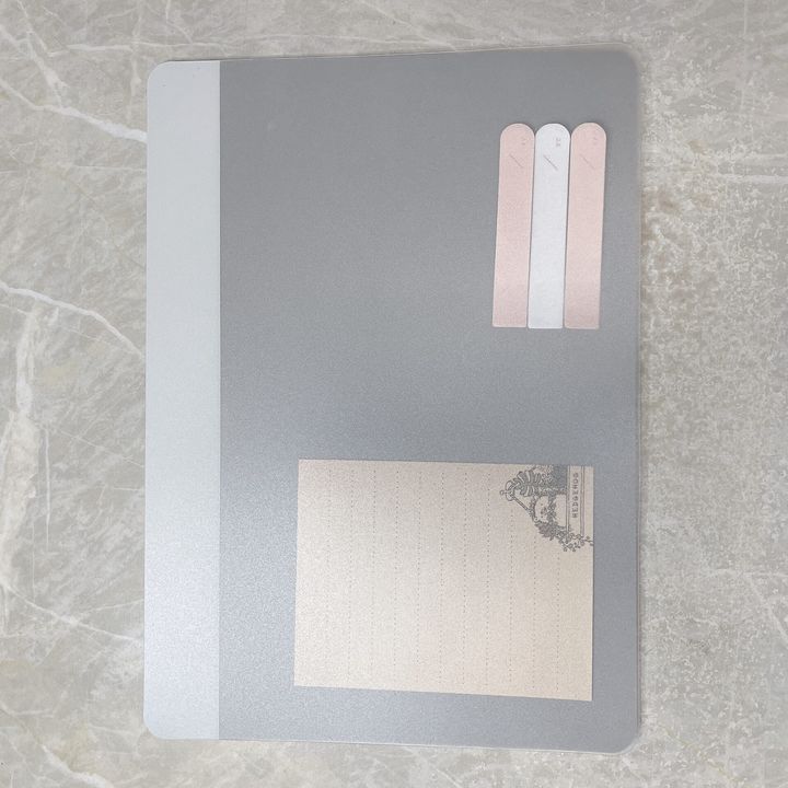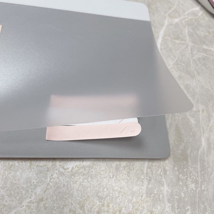実際にメモや付箋を挟んでみた様子です。すりガラスのような半透明のカバー越しでも中の文字ははっきりと視認でき、TODOリストの確認に最適です。