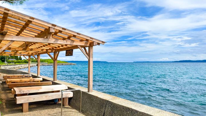 海岸沿いに位置し、歩いて30秒で海に出られます。晴れた日には、外のテラス席で波の音を聞きながら食事をするのがおすすめです。