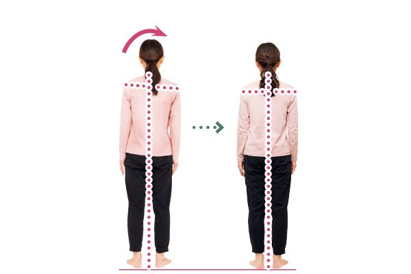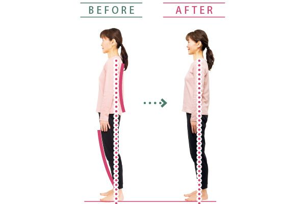 反り腰だった齋藤さんは、片脚バランス立ちとスクワットを実践。骨盤が正しい位置になり、背すじもシャキッとしました。
