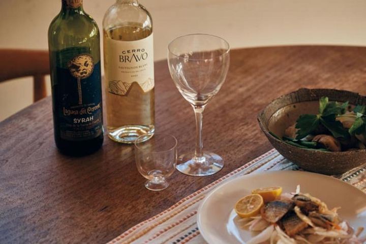 365日お酒を飲むわたしに、夫は小さなグラスでつき合ってくれます。おかずは自家農園のイモと玉ねぎの煮物や魚の南蛮漬けなど、野菜中心で塩分控えめに。一日別々に過ごしたからこそ話題はいろいろ。これが夫婦の円満の秘訣です。