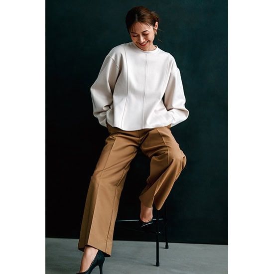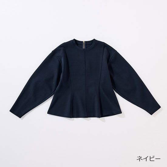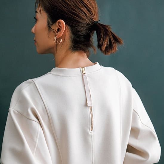 一見シンプルなトップスですが、ポイントになる切り替えと、ほんのりフレアに広がるシルエットで地味にならない。甘疲れにも有効なデザイントップスです。縦に大きく入った切り替えがコーデのアクセントに。縦のラインはすっきりと細見えが叶います。タイトスカートやカジュアルパンツなどとも合わせやすく、汎用性が高い。ストラップ付きのバックジップで後ろ姿もサマになります。