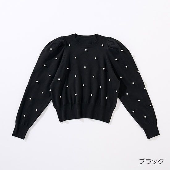①前面にちりばめた大粒パールと肩のふんわり感!「華やぎニット」