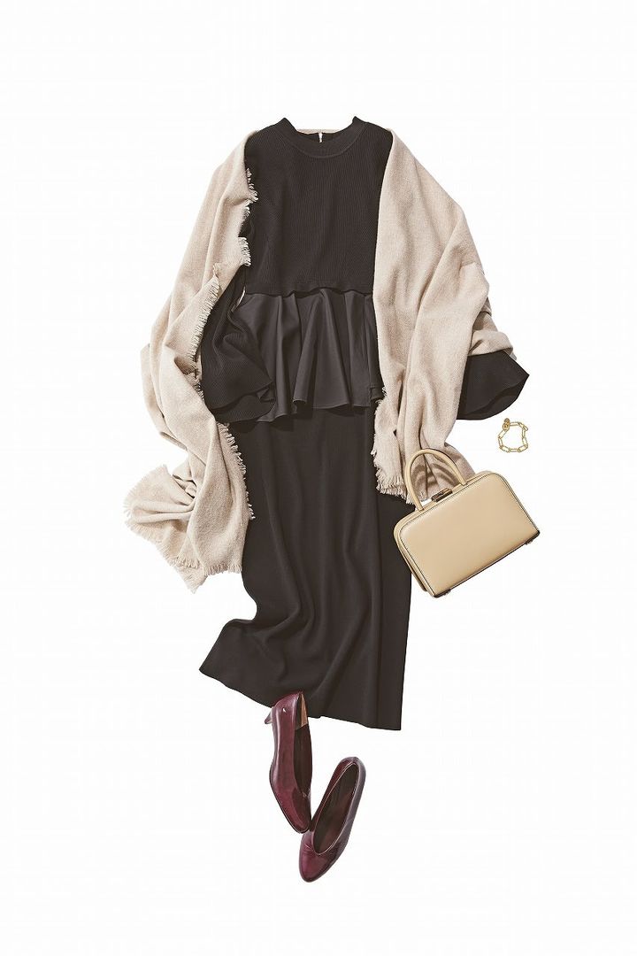 黒ワンピにミルクティー色の大判ストールをふわりと重ねて柔らかな印象。黒の分量を調整することで、女性らしさと抜け感が生まれます。ペプラムシルエットのおかげでシンプルでも自然に着映えるコーデに。