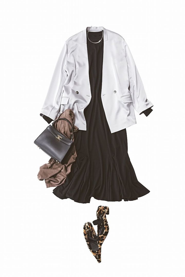 シルバーのジャケットを重ねて辛口な華やぎをプラス。直線的なアウターが、フレアワンピの甘さを程よく中和します。ゴージャスになりすぎず、知的で洗練された雰囲気のスタイル。