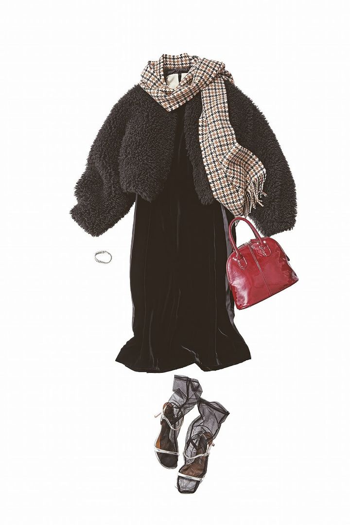 艶やかなベロアの黒ワンピにボアを羽織ってグッと華やかに。上品な千鳥柄で持ち前の好感度をさらにUP。黒ベースでも重くならず、夜に映えるコーデです。