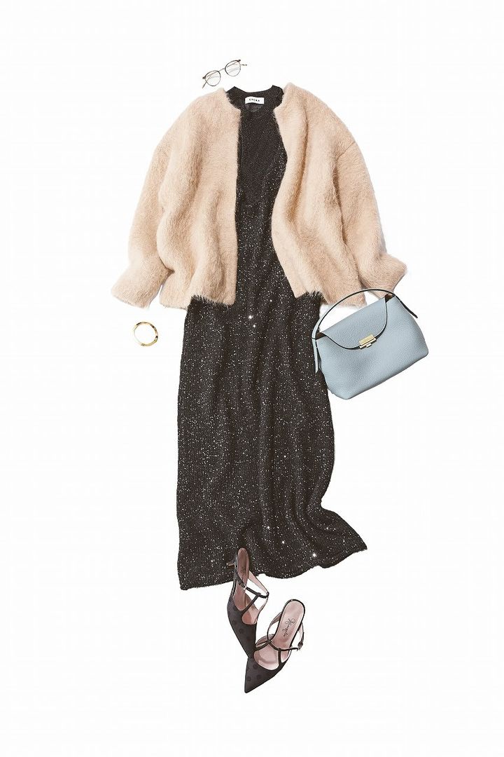 キラキラ黒ワンピにはサンドベージュのファーカーデで優しさをプラス。夜っぽアイテムを、柔らかな色と質感でエレガンスに。新年の集まりなどの少し特別な日に映えるコーデ。