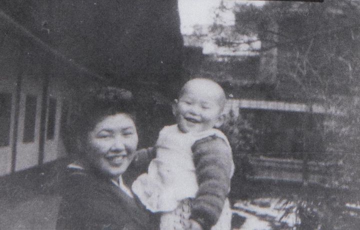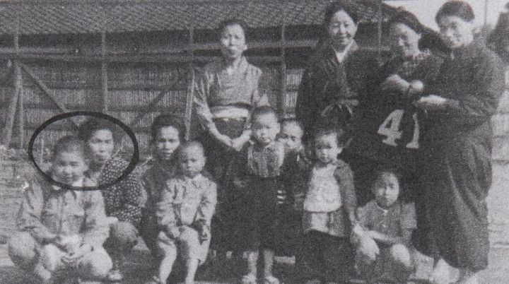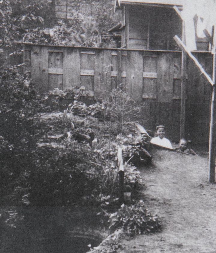 東京・巣鴨の会社員家庭に6人きょうだいの末っ子として誕生。家族から深く愛されて育った。自宅の防空壕から顔を出して遊ぶなど(写真)、おっとりしたのびやかさは生来のもの。空襲で自宅全焼の後は、千葉県柏市に転居。