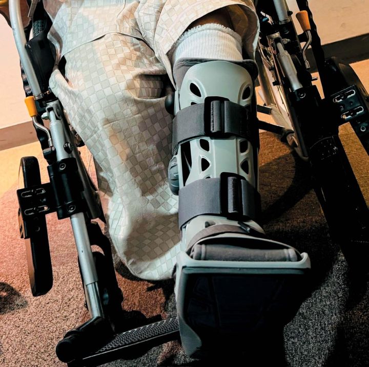 アキレス腱断裂の治療。ロボット気分が味わえる今どきのギプスが、少し自慢だったとか。