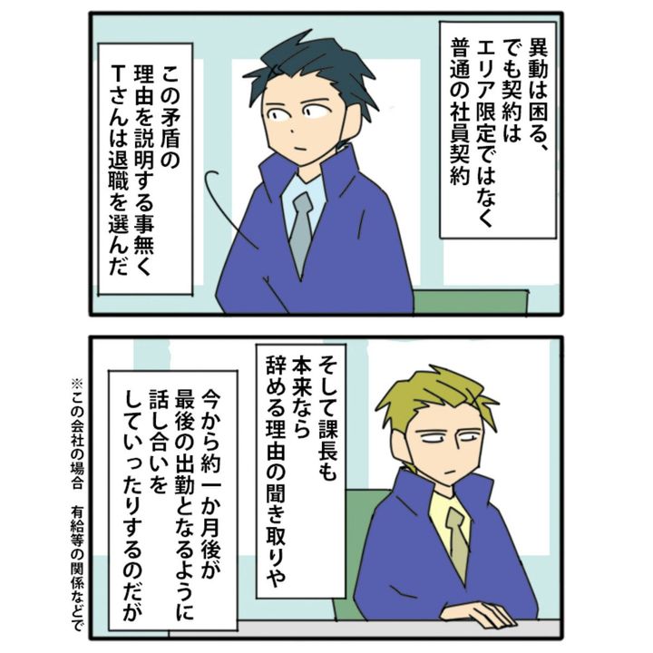 課長は「ミスとは関係ない」と説明しますが、Tさんは納得していない様子。そこで課長は、「異動も契約内容に入っている」と、切り出します。