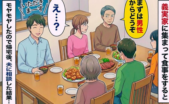 義実家で家族全員が集まった夕食の席。私はそこで、今も根強く残る“男性ファースト”の習慣に直面しました。
