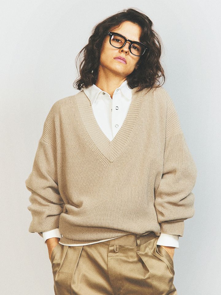 身幅が大きなシルエットで、インナーを仕込むことが前提のVネックニット。ぬくもりのある雰囲気には、シンプルな中にどこかモードさがある白インナーの選びがシャープに装うコツ。