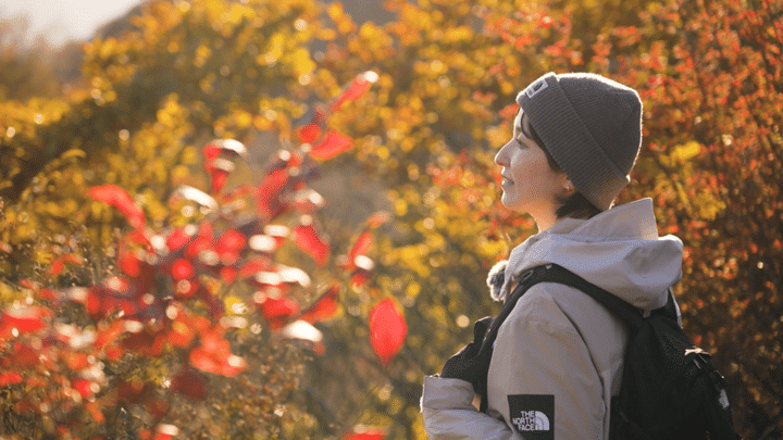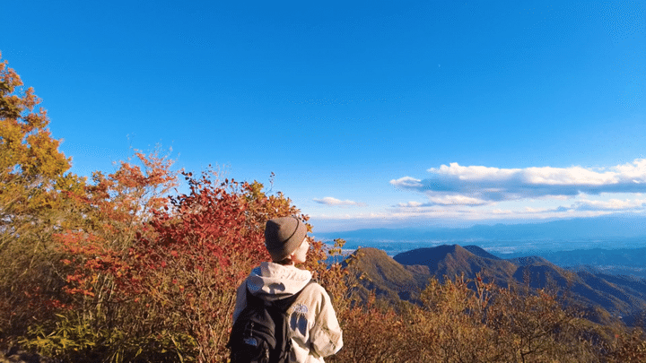 さあ、山頂まであと一息。登山道へ戻った戸田さん、傾斜のきつい登り道に息を切らせながらも紅葉の美しさに励まされてひたすら足を進めます。とうとう標高1,449mの掃部ヶ岳の山頂に辿り着きました。空と湖の鮮やかな青色に対して、紅葉に染まった周囲の山の赤色や黄色が鮮やかなコントラストを生み出しています。それはまさに、この季節に山に登った人にしかしか見ることができないご褒美でした。