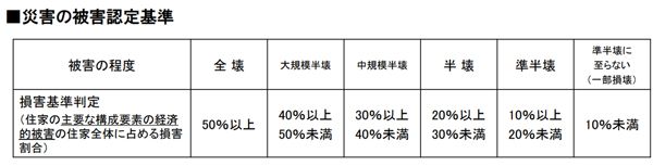この住家被害認定は、被害の大きな順に、「全壊」、「大規模半壊」、「中規模半壊」、「半壊」、「準半壊」、「準半壊に至らない」(一部損壊)という6段階に区分されています。