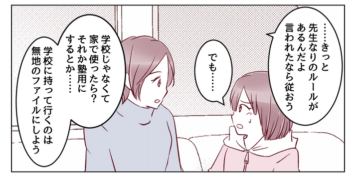 なんだかモヤモヤします。ただ、私がゆっくり話を聞いてあげているうちに、ミユは落ち着いてきたようです。「先生がダメって言うなら、持っていくのは無地のファイルにしよう」私がそう提案すると、素直にうなずいてくれました。