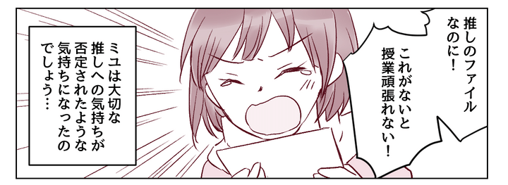 ミユがランドセルから取り出したのは、ミユが大好きな人気Vtuberがプリントされたクリアファイルでした。なんと先生から、学校に持ってくるのを禁止されたというのです。ミユは大切な推しを否定されたようでショックを受けています。