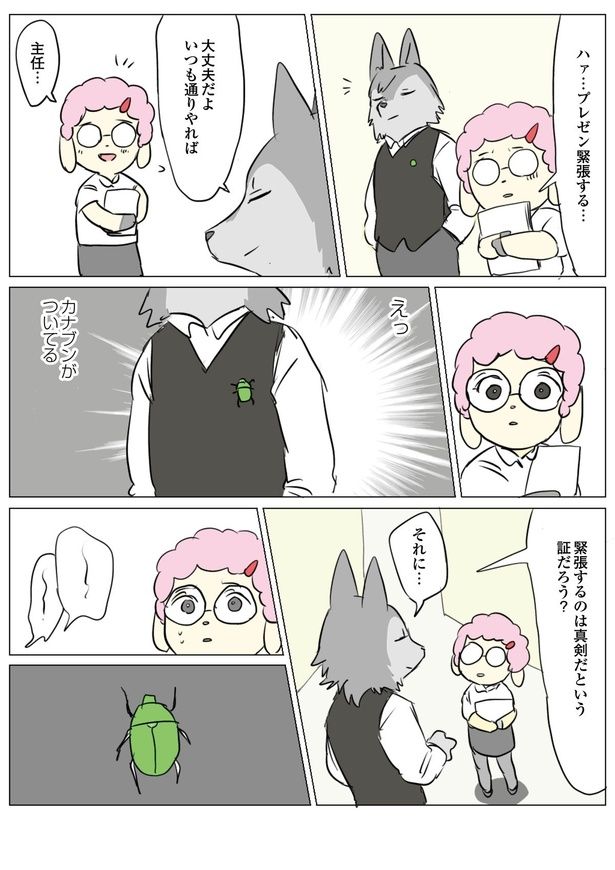 2. 主任の服にカナブンが! 気になって励ましの言葉が頭に入ってこない/働く!くよくよ犬㉚