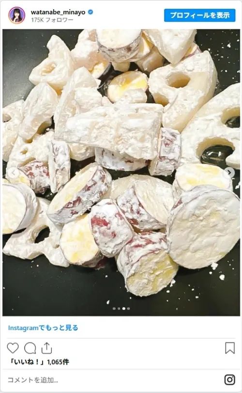さらに、水にさらしたサツマイモとレンコンや、片栗粉のようなものをまぶした途中経過の写真も一緒にアップされています。