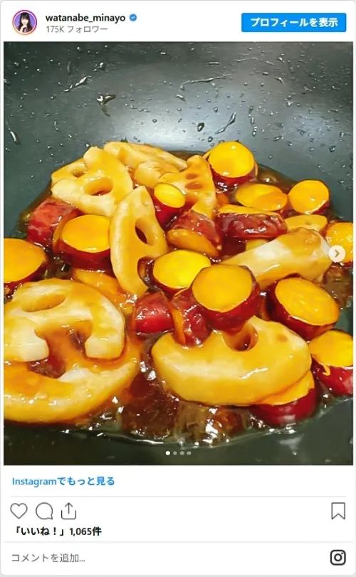 2025年11月28日、歌手でタレントの渡辺美奈代さんがInstagramを更新し、旬の食材であるサツマイモとレンコンの作り置き料理を披露しました。