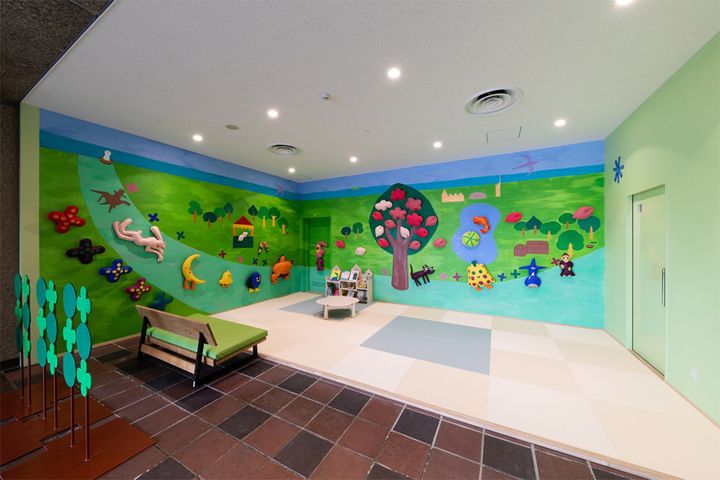 アーティスト・オーギカナエさんが制作した可愛らしい空間が広がる「キッズスペース  森のたね」。畳の上でゆっくり絵本を読んだり、壁から取りはずしができるオブジェで遊ぼう! パパも入れる授乳室「赤ちゃんの休憩室」と女性専用の授乳室を併設。CHECK