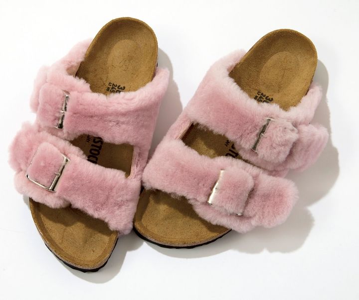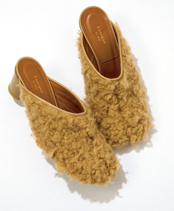 [上から]秋冬だからこそ楽しめるサンダル、待ってました! ¥23,100/ビルケンシュトック(ビルケンシュトック・ジャパンカスタマーサービス)、大人っぽく履けるプードルファー。ソックス合わせを楽しんで。¥33,000/リュニックエ モア(トーケン)