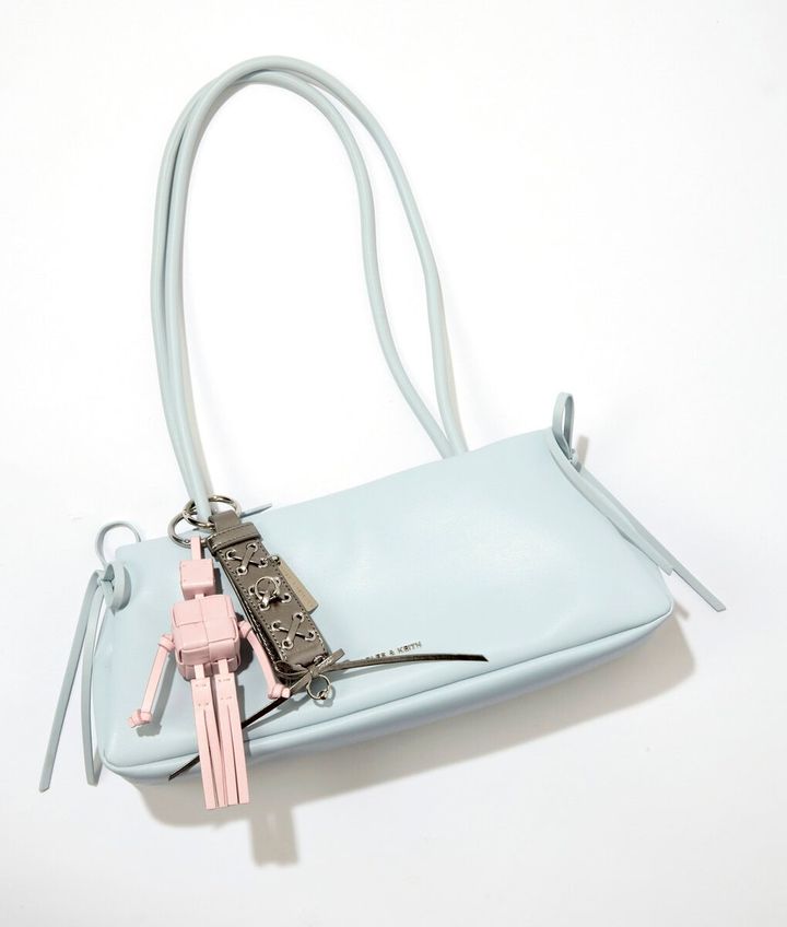 [上から]バッグとチャーム、双方の可愛さをよりアップさせる色使いもよき! ¥7,690、チャーム¥2,790[参考価格]/ともにビヨンド ザ バインズ(リディア)、チャームはじゃら付けして♡ バッグ¥13,500、ロボットチャーム¥3,900、シルバーチャーム¥2,500/以上すべてチャールズ&キース(CHARLES & KEITH JAPAN)