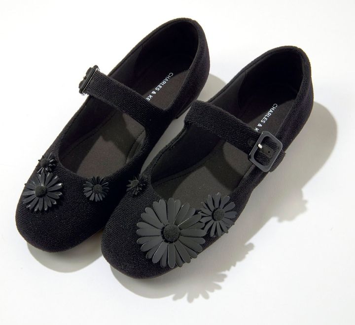 [上から]フラワーパーツをつけてカスタムできる! ¥9,900、付けた花ビーツ¥1,500/ともにチャールズ&キース(CHARLES & KEITH JAPAN)、安定感のある履き心地のフラットシューズ。¥14,300/メリッサ(メリッサ シューズ ジャパン)
