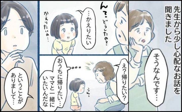 先生の話によれば、そのときも娘は元気がない様子でトボトボと先生の後ろに来るなり、「……かえりたい」と言ってきたとのこと。この様子を見た先生が、「おうちに帰りたい……。ママと一緒にいたいんだな」というメッセージだと勘違い。心配した先生は帰り際にこの出来事を話してくれ、「ゆっくり休んでね」と言ってくれたのです。