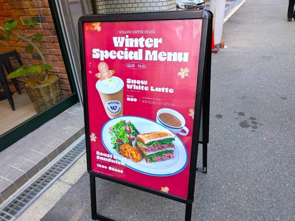 ラテが選べるsnow white latte(850円)、ローストビーフサンド(1800円)、セット(サラダ・ポテト・スープ付、2000円)のウインタースペシャルメニューもあります。