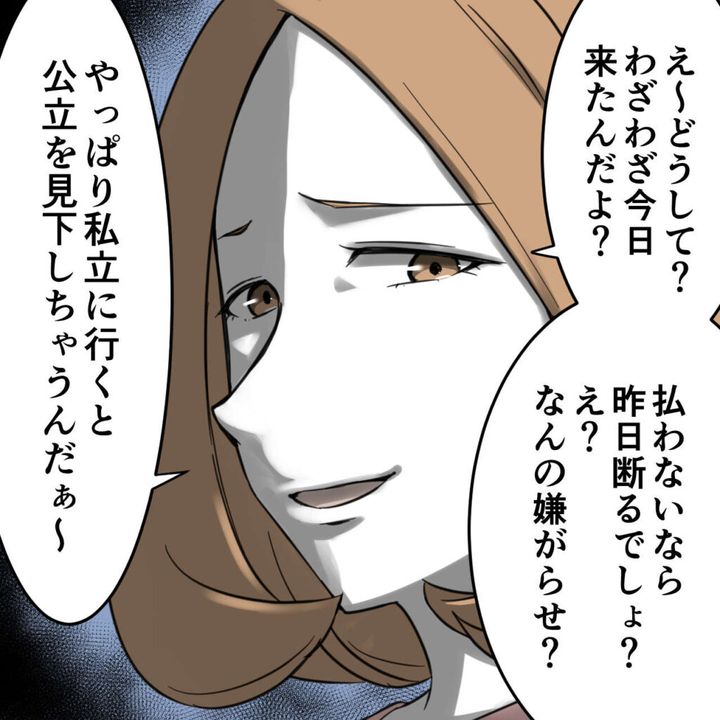 するとニコニコしていたハルちゃんママの表情がガラリと変わりました。「どうして?わざわざ今日来たんだよ?払わないなら昨日断るでしょ?え?なんの嫌がらせ?」と嫌悪感をあらわにしたハルちゃんママは、「やっぱり私立に行くと公立を見下しちゃうんだぁ~」と嫌味たっぷりに言いました。ナミが私立中学に通っていることをハルちゃんママが知っている事にも驚きですが、公立を見下すなんて思ってもいなかったことを言われて驚きしかありませんでした。